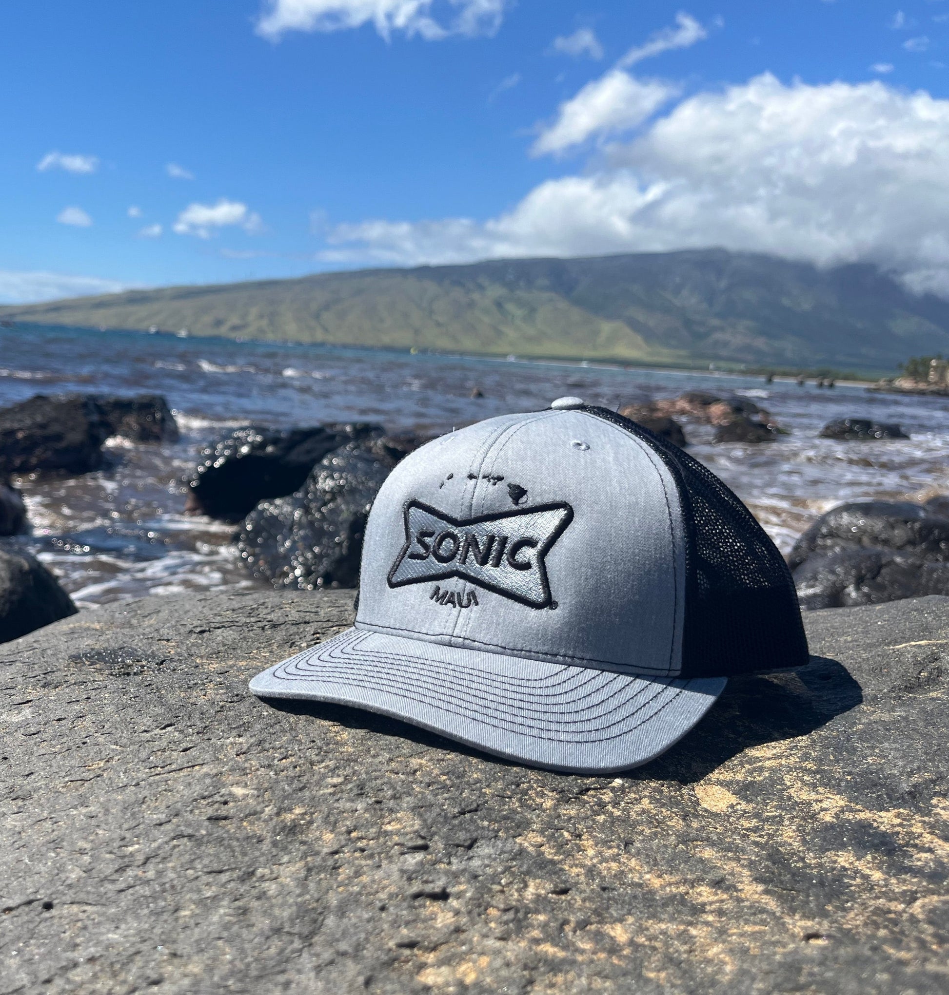 The Sonic Hawai'i hat features a sleek grey front, complemented by a breathable mesh back. Adjustable strap offers comfort and flexibility for heads of all sizes. The Sonic Maui logo is displayed on the front in black embroidery and the Aloha with hibiscus flower is stitched in grey on the back.